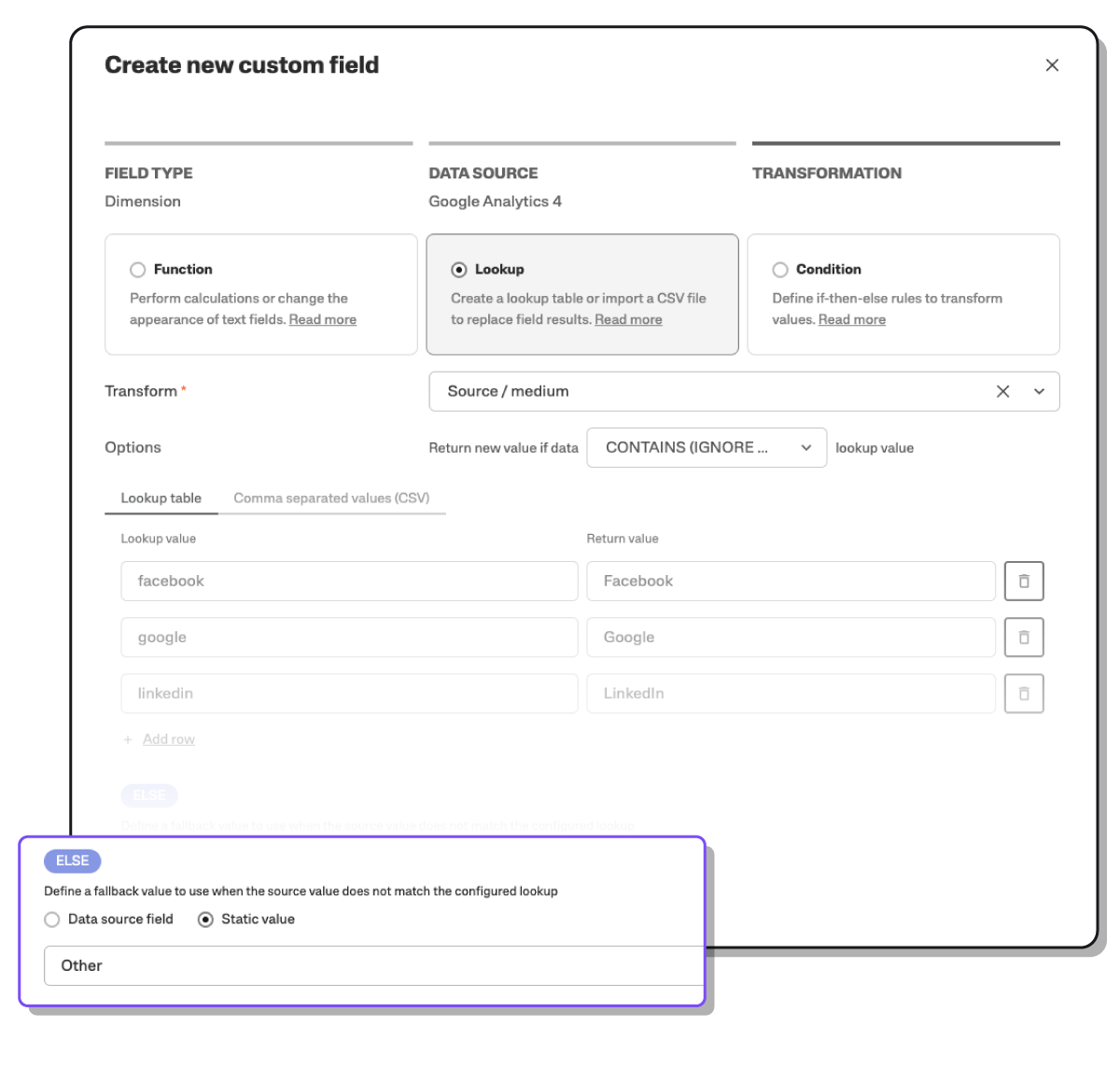 Previously, it returned the original value if you didn’t set a lookup value for a specific field. Now, with the ‘ELSE’ condition, you can define what the custom field shows when the lookup doesn’t have a matching set value. Here are the fallbacks you can use: