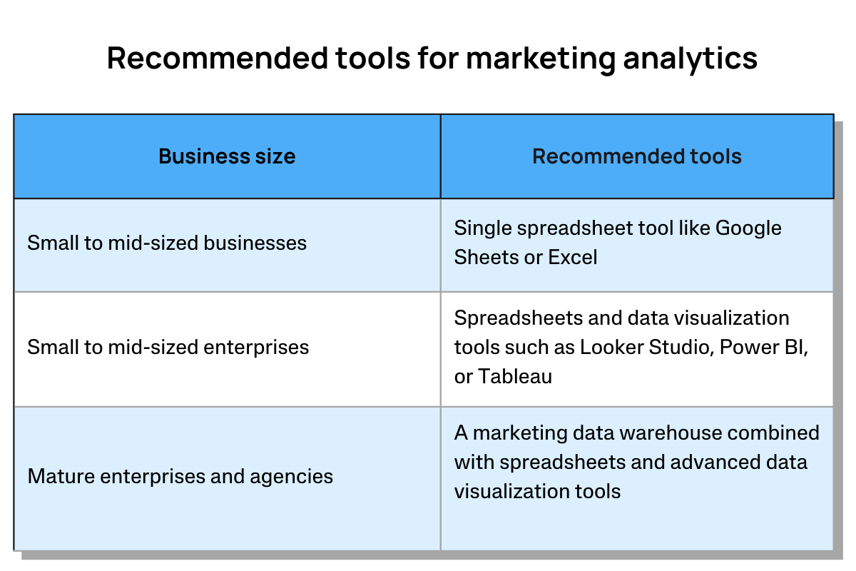 Training tip: If team members struggle with understanding or modifying reports, consider organizing a series of workshops dedicated to upskilling everyone on basic marketing analytics concepts. Everyone should understand how your spreadsheets are structured, where the data comes from, and what the formulas represent. You can also address how to adjust formulas in Google Sheets or Looker Studio. When it comes to data warehouses, the team should understand how different tables can be joined to generate the insights needed. Also, clarify the distinction between managing data in a warehouse vs. directly reporting through visualization tools.