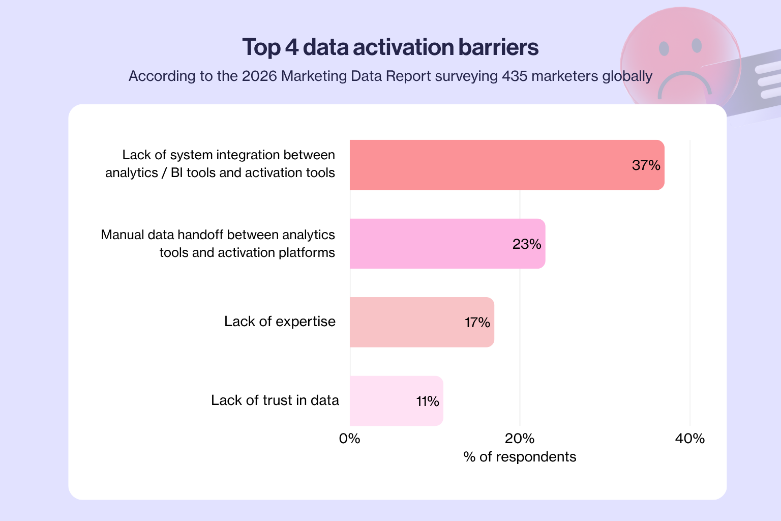 - 37% cite a lack of system integration between analytics and activation tools as their top barrier. Another 23% point to manual data handoffs.