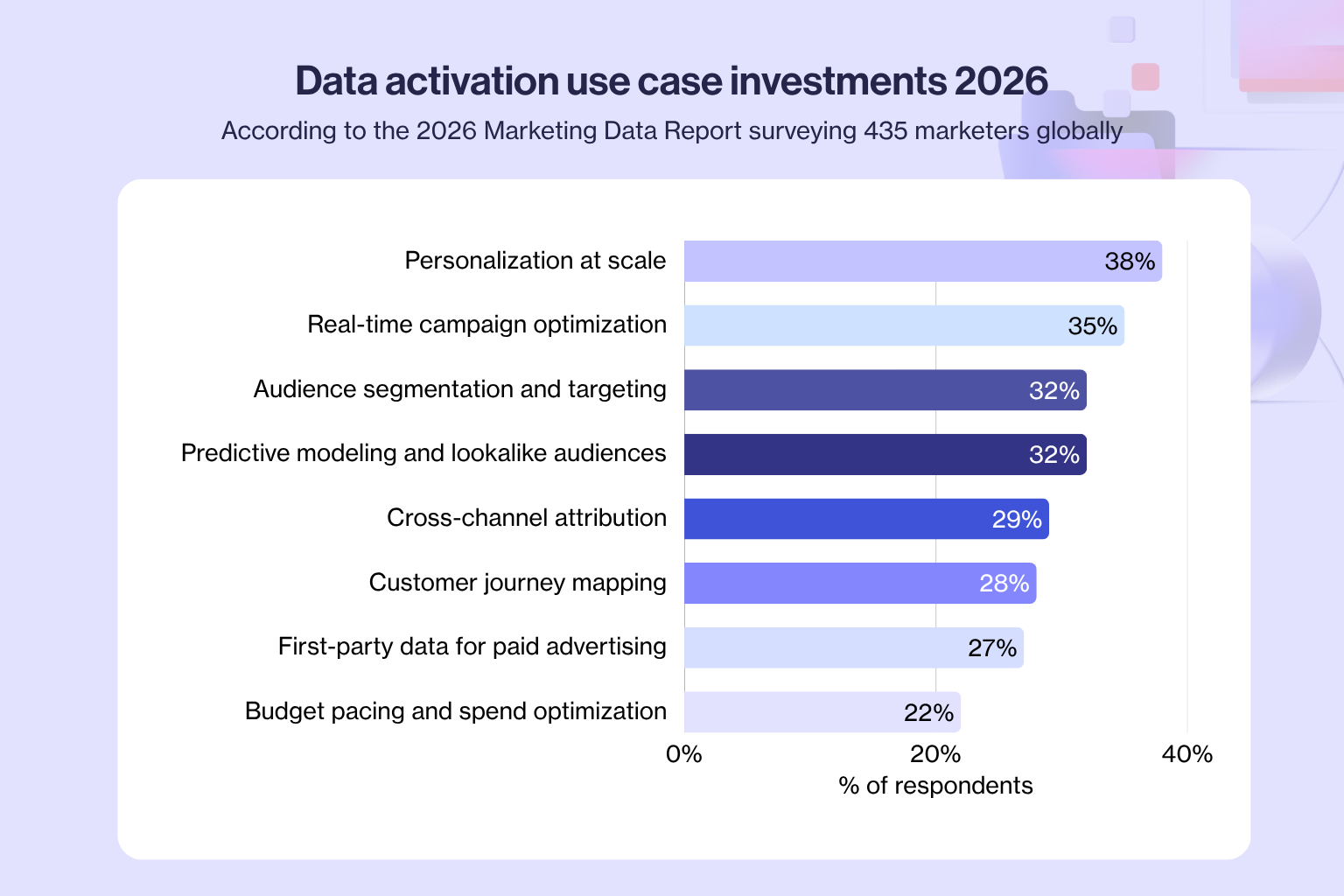 Personalization at scale is the top data activation investment priority for 2026, with 38% of marketers planning to invest in it. After years sitting on to-do lists, this might be the year activation happens on a meaningful scale.