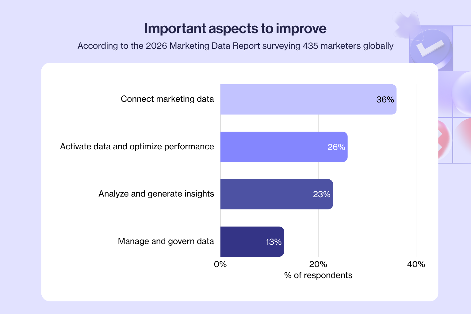 And the longer marketers have to wait on other teams to access or prepare their data, the wider the gap between insight and action becomes. A campaign optimization that takes three days to execute is a campaign that's already spent budget on the wrong audience. That's why 36% say connecting marketing data is the single most important area to improve.