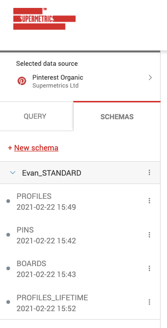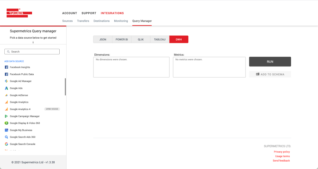 There are two ways you can move data with Supermetrics: 1) with our standard schemas that cover the most common use cases or 2) with custom schemas that you can create, save, manage, and edit with the query manager.