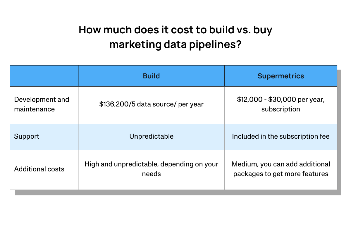 Typically, companies build their solution because this approach gives them more control and customization. For example, you can follow your internal security guidelines or tailor the pipelines to suit your data needs. Additionally, if you already have a team of engineers and developers, you may think it’s cheaper to take this in-house than pay for a tool. However, maintaining and updating marketing data pipelines has many hidden costs.