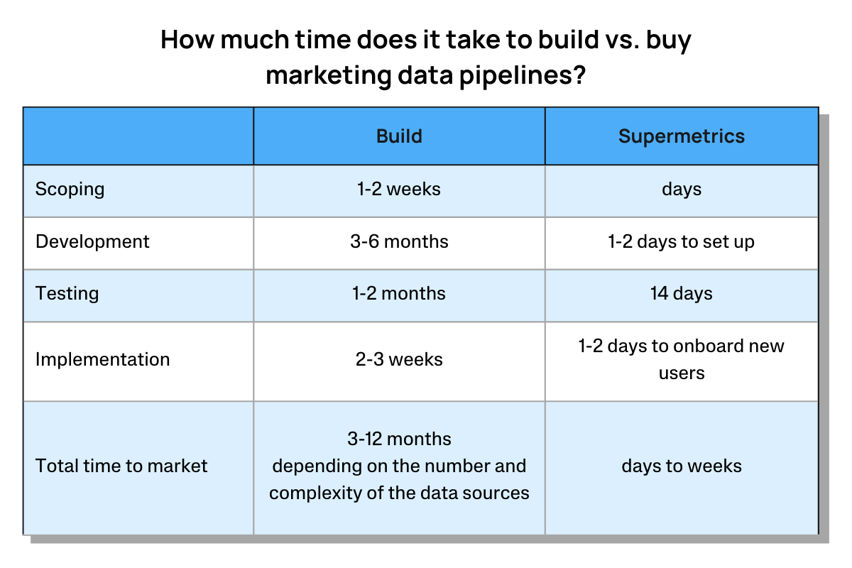 In contrast, purchasing a solution means you can benefit from the expertise of a vendor whose main focus is managing data pipelines. These vendors employ specialists who update the solution with the latest features and compliance requirements. For example, at Supermetrics, our bread and butter is marketing data. We do our best to build connectors and features that support marketing use cases.