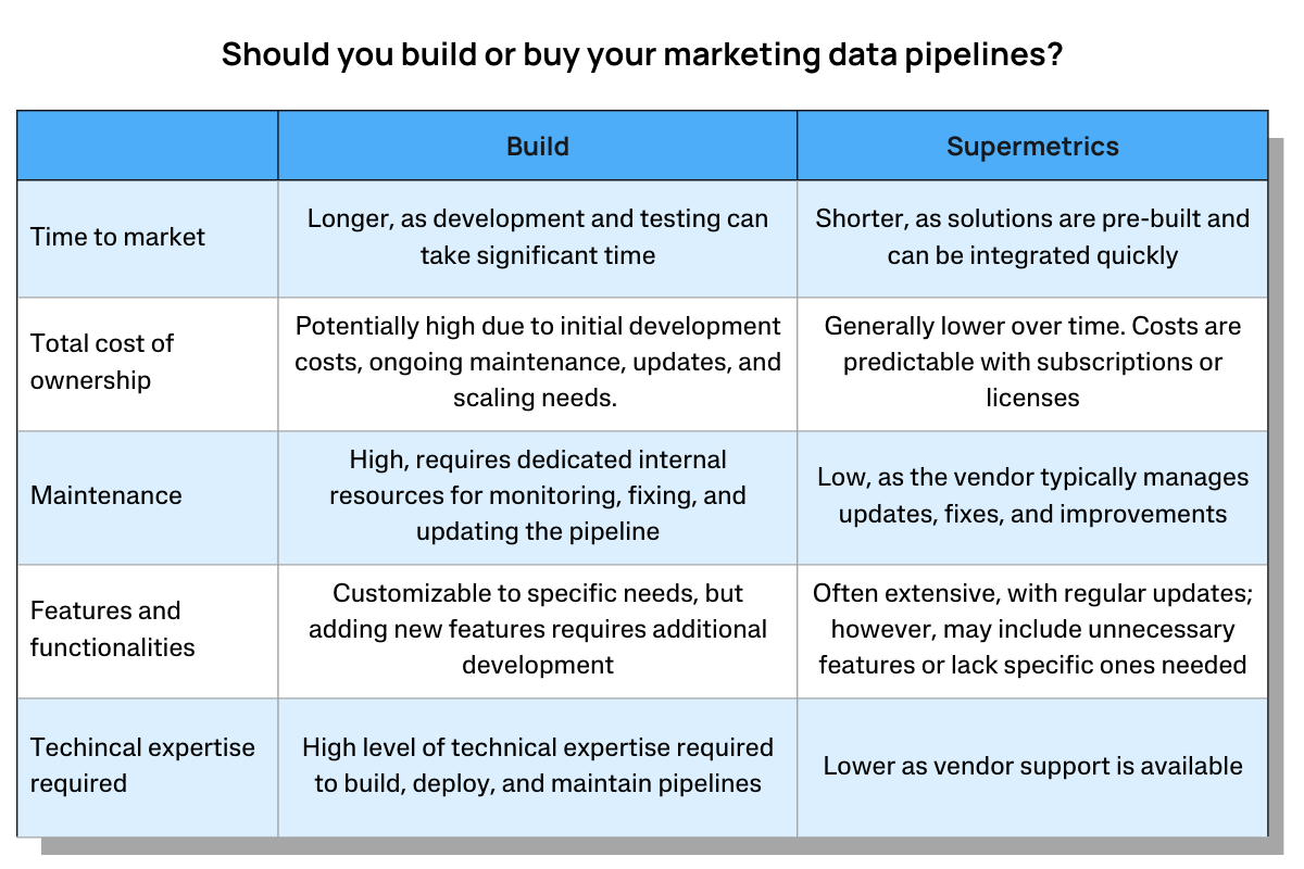 To build or buy a marketing data pipeline depends on several factors: how quickly you need it, the total cost, the features you need, the expertise available, and risk management.