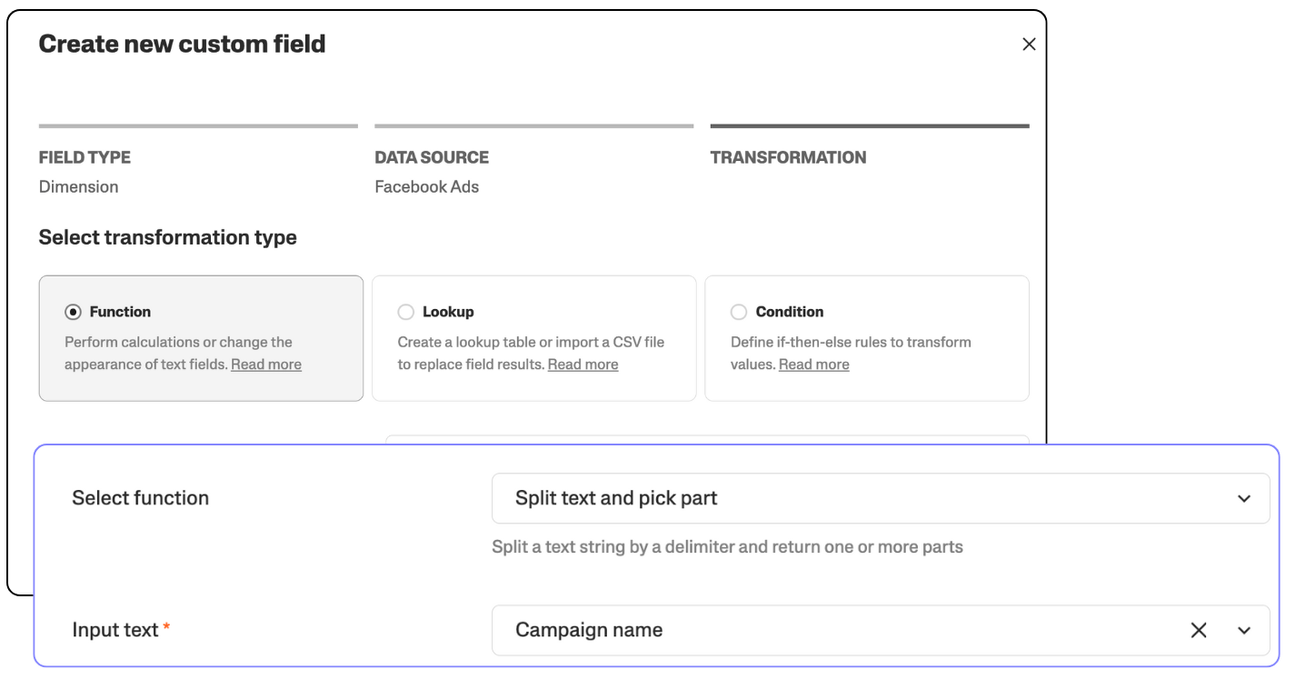 - Then, use the ‘split text and pick part’ function to break down campaign names into parts, making it easier to detect inconsistencies.