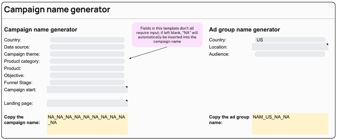 Even the best naming systems fail without adequate adoption. That’s why we strongly recommend building on a proven campaign naming convention template—like this campaign name generator template for Google Sheets . It outlines naming structures that work across platforms and helps teams align on what “good” actually looks like.