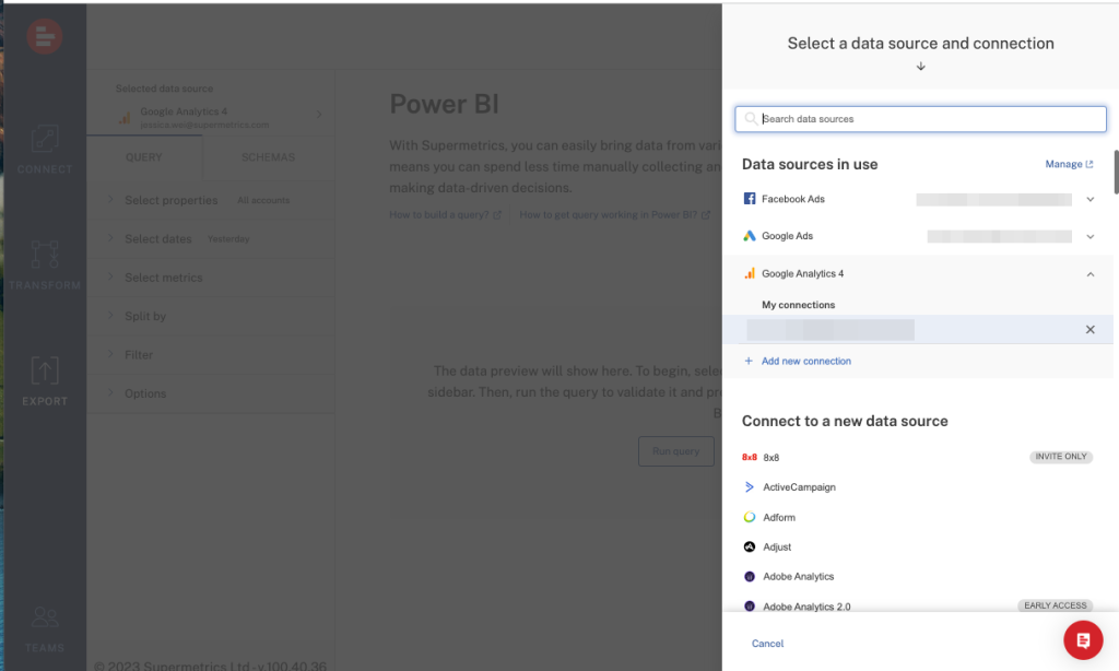4. Select GA4, then log in to your GA4 account to create a connection between the data source and Supermetrics.