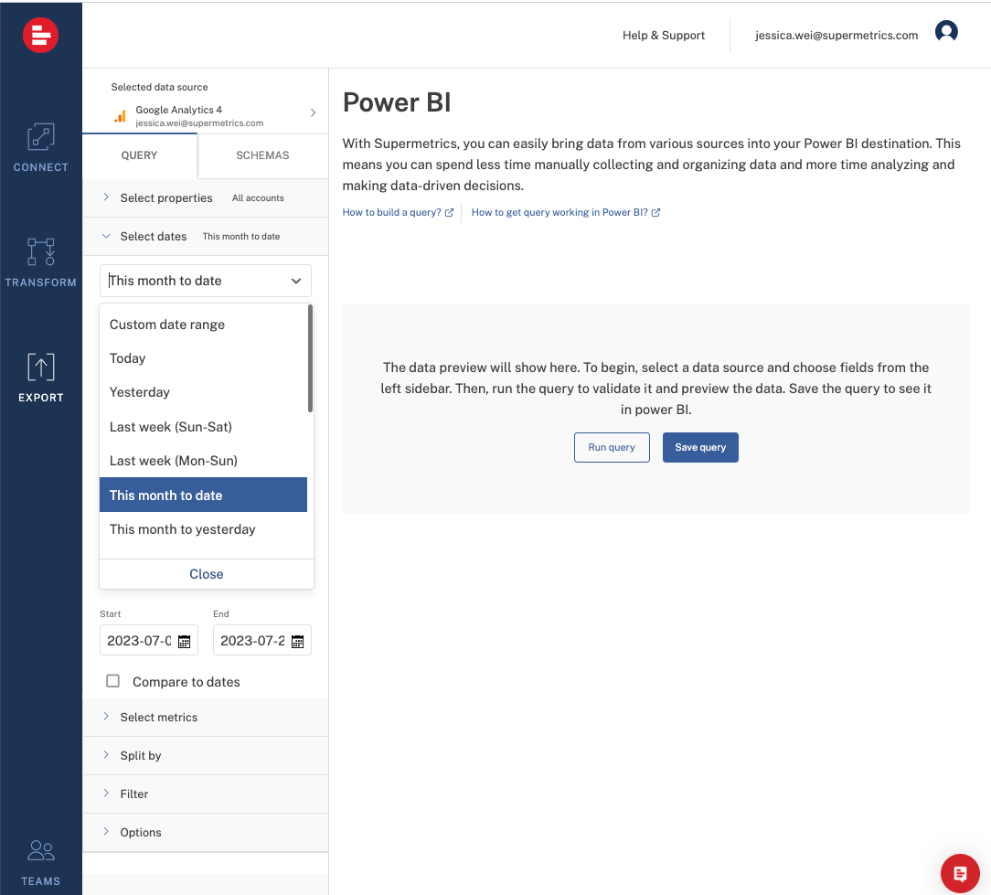 - Create a query on Supermetrics Hub (Supermetrics’s data interface)
