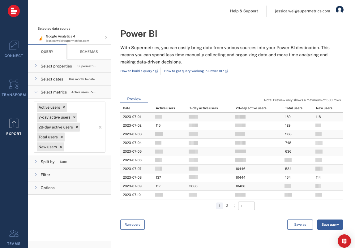 6. Lastly, click Run to see what your report will look like, then Save. Name your query and query group, and you’re good to go. You can find out how to create a Supermetrics query for Power BI by reading these instructions.