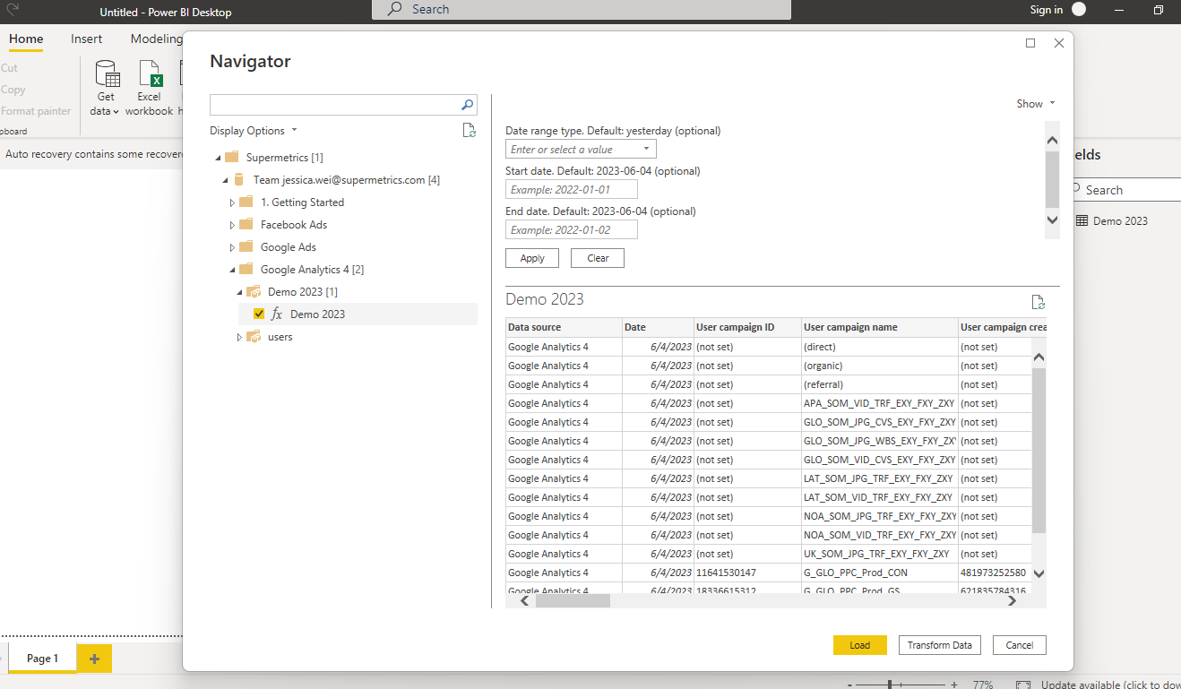 - Preview your selected dimension and metrics before loading them to Power BI.