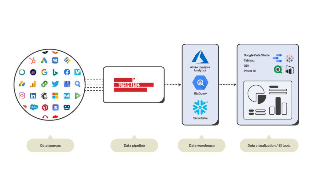 You don’t need to provision expensive hardware or get access to a physical data center to start centralizing your marketing data in a cloud-based warehouse. Simply choose your data warehouse (e.g. Google BigQuery, Azure Synapse Analytics, or Snowflake) and start moving your data with a fully managed pipeline like Supermetrics.