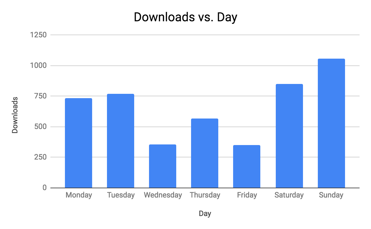 Google Play store and Apple App store can provide reports on this metric. You can easily build a “Downloads per day” chart with the help of Supermetrics Google Sheets Add-on . This chart allows management to easily get an understanding of what day of the week is the most popular for app downloads.