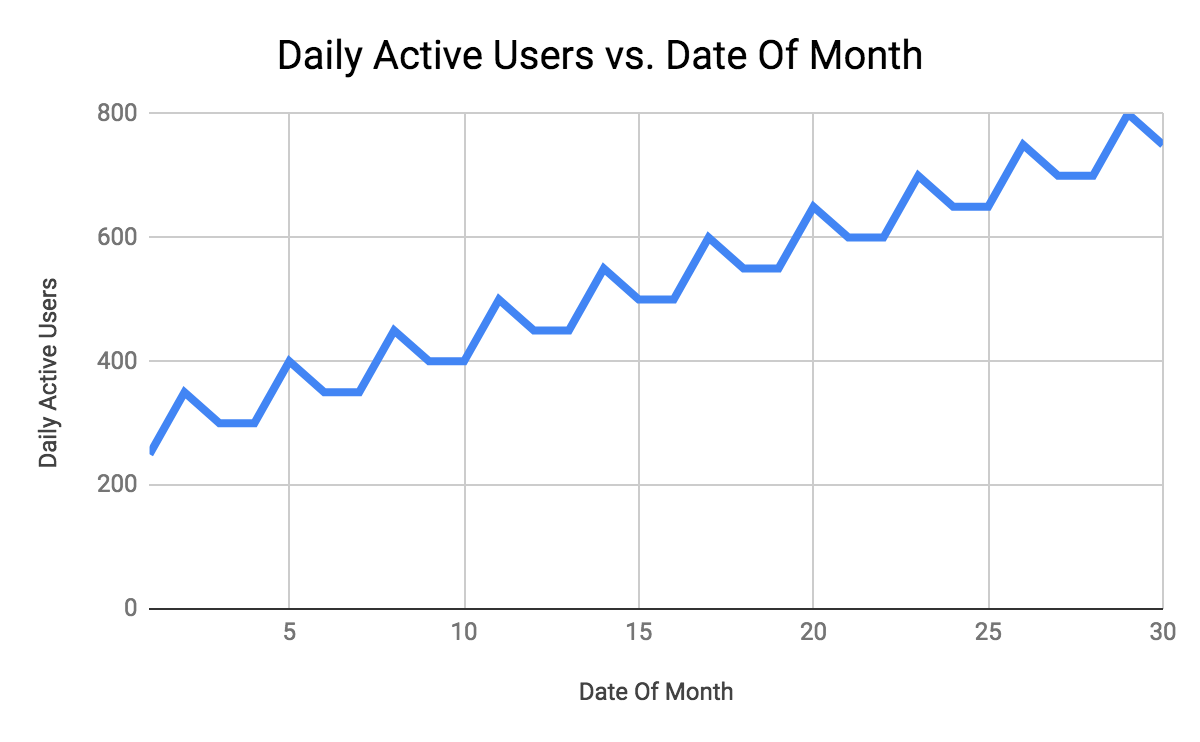First, there’s Daily Active Users (DAU). This number will tell you whether people are using the app and how many people find your app indispensable. The chart below was built with Supermetrics for Google Sheets and it shows the progression of Daily Active Users across the period of a month.