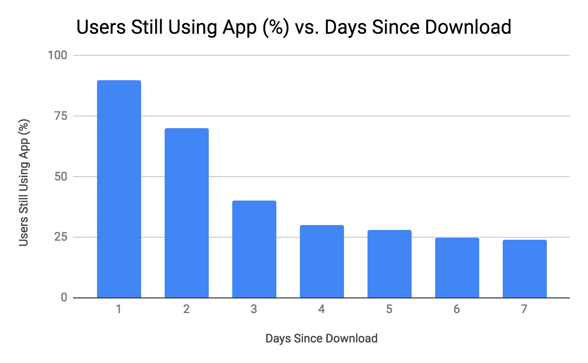 To do this, look at first-time app launch to build an acquisition cohort. Once you have that, you can monitor how long the cohort stays active in the app. For instance, you can look at a specific timeframe and monitor retention – after 3 days, after 7 days, and after a month. This will help you determine when people abandoned using the app, and therefore what qualities of the app improve or impede retention. This chart shows the prominent drop-off points after users download the app: