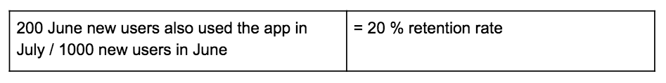 Here’s an example. Figure out how many new users you had in June, and use that to calculate month over month retention. Divide the number of the June new users who used the app in July by the total number of new users in June:
