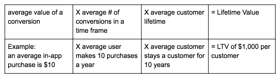 Lifetime value (LTV) is targeted at calculating how much value to expect from an average customer during the time they are customers of your app. This can be revenue or profit and can be before marketing costs are applied or after. It’s important to determine that in advance so the calculations are consistent.