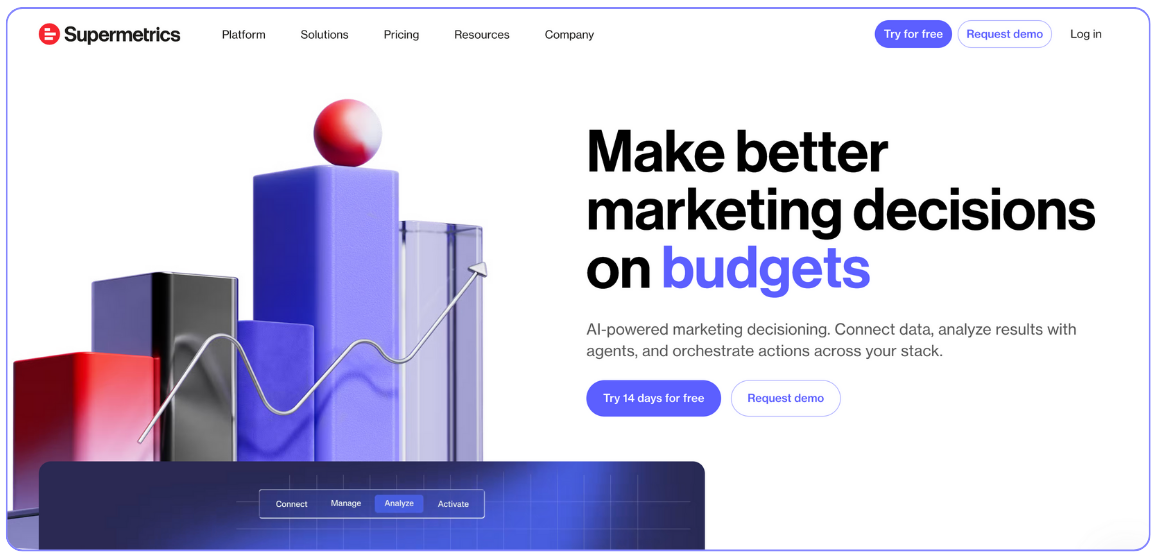 For over 15 years, Supermetrics has empowered marketers to make sense of their data. With our Marketing Intelligence Platform, marketing teams can easily connect, manage, analyze, and activate data, all without technical support.
