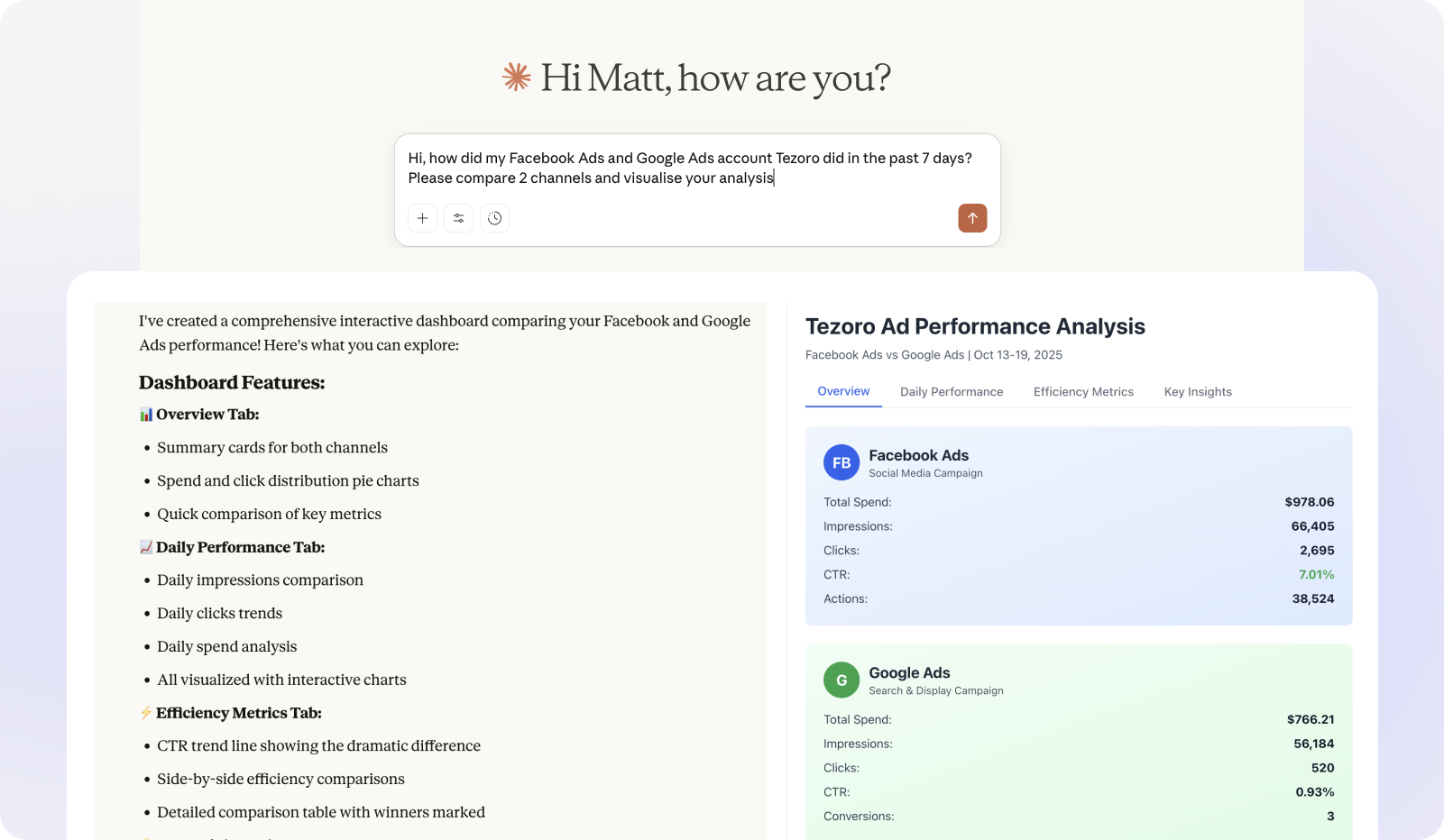 Now we’re taking that vision further with Supermetrics AI — a suite of capabilities that embeds intelligence across the Supermetrics Platform. With these advancements, marketers can move beyond manual analysis to make faster, smarter decisions powered by AI.