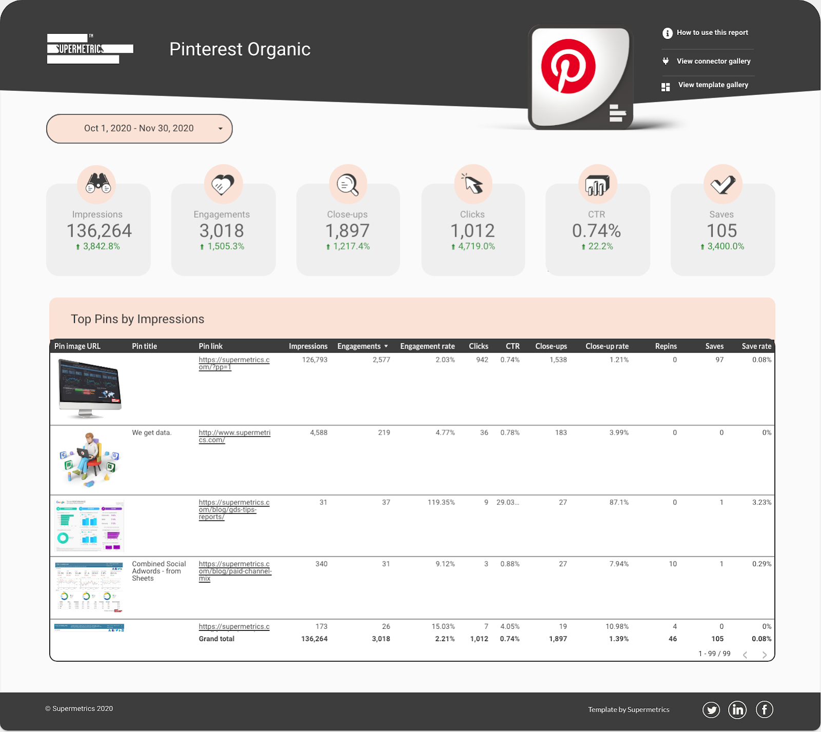 Start your free trial of Supermetrics to combine Pinterest Ads and organic data in your reports. Track performance across the funnel and optimize your creative and targeting with ease.