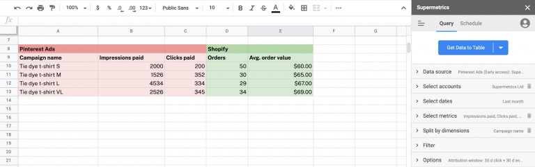 Do you manage a Shopify ecommerce store and run campaigns on Pinterest? If so, you can use Supermetrics’ Shopify and Pinterest Ads connectors to easily create an ecommerce marketing funnel report. With this report, you can link your Pinterest ad performance metrics with revenue data coming from Shopify.