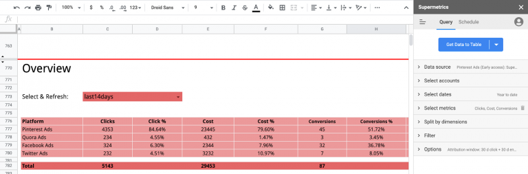 Pinterest Ads is a great addition to your marketing channel mix. You can use Pinterest alongside Facebook Ads, Twitter Ads, Quora Ads and other paid social channels. With the help of Supermetrics, you can easily create a paid channel mix report that will help you compare the ROAS of your campaigns across different platforms.