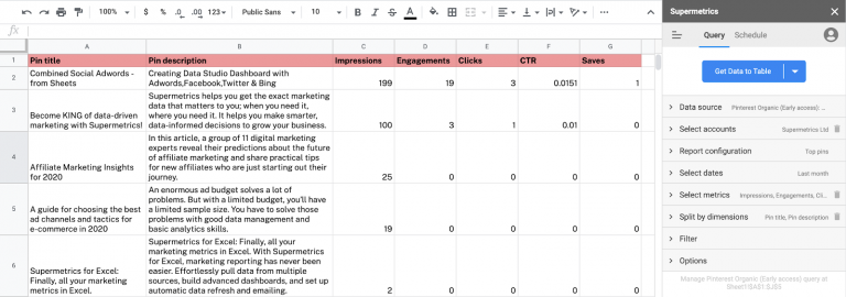 With the help of Supermetrics, you can easily create a Pinterest Ads report in Google Sheets, Google Data Studio, or Excel.