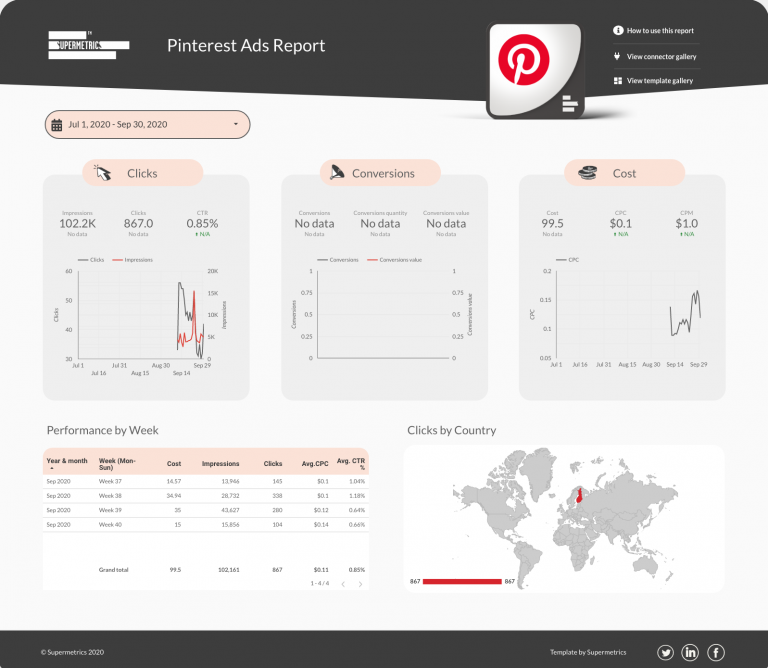 - Create a Pinterest dashboard in Google Data Studio or use our ready-made templates for Pinterest Ads and/or Pinterest Organic