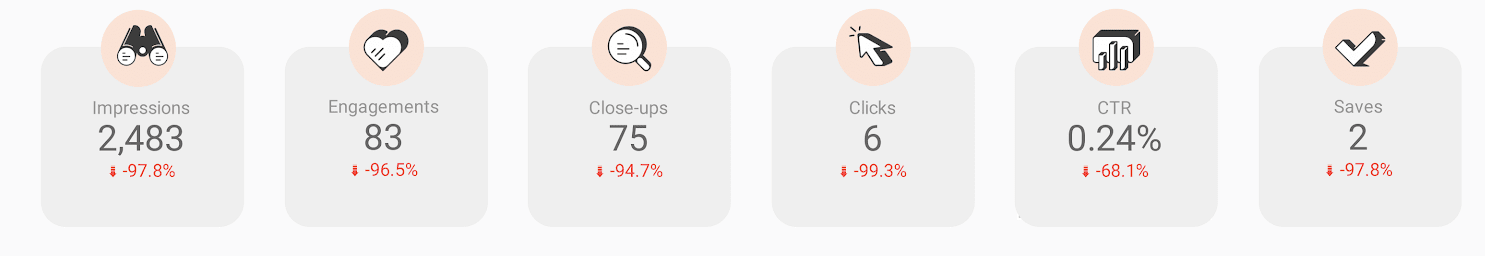 You’ll see scorecards showing impressions, engagements, closeups, clicks, CTR, and saves at the top of the dashboard. The scorecards also show you a comparison to the previous period.
