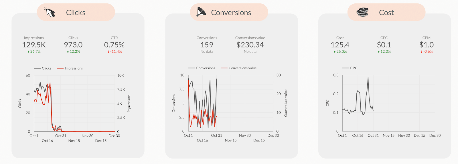 First, you’ll see scorecards representing clicks, conversions, and cost. This data helps you understand: