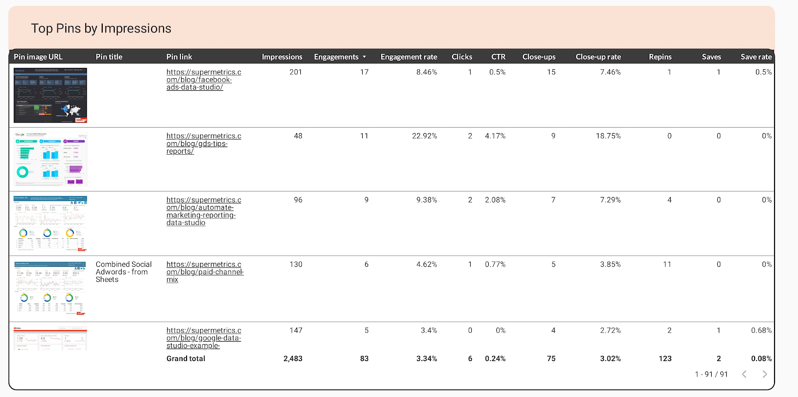 Next, you can see a table showing your top pins. Here you can find what’s working and what isn’t with your content strategy.