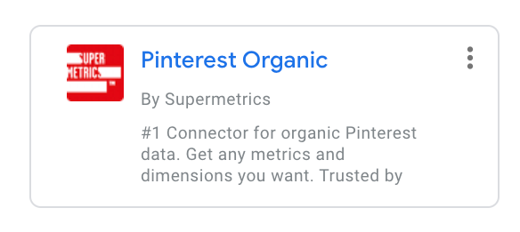 In the connector gallery, search for a connector called “Pinterest organic by Supermetrics.” or “Pinterest Ads by Supermetrics.”