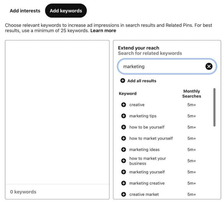 In the right column, type any keyword for your blog topic. Pinterest will automatically show you related keywords and their monthly search volumes.