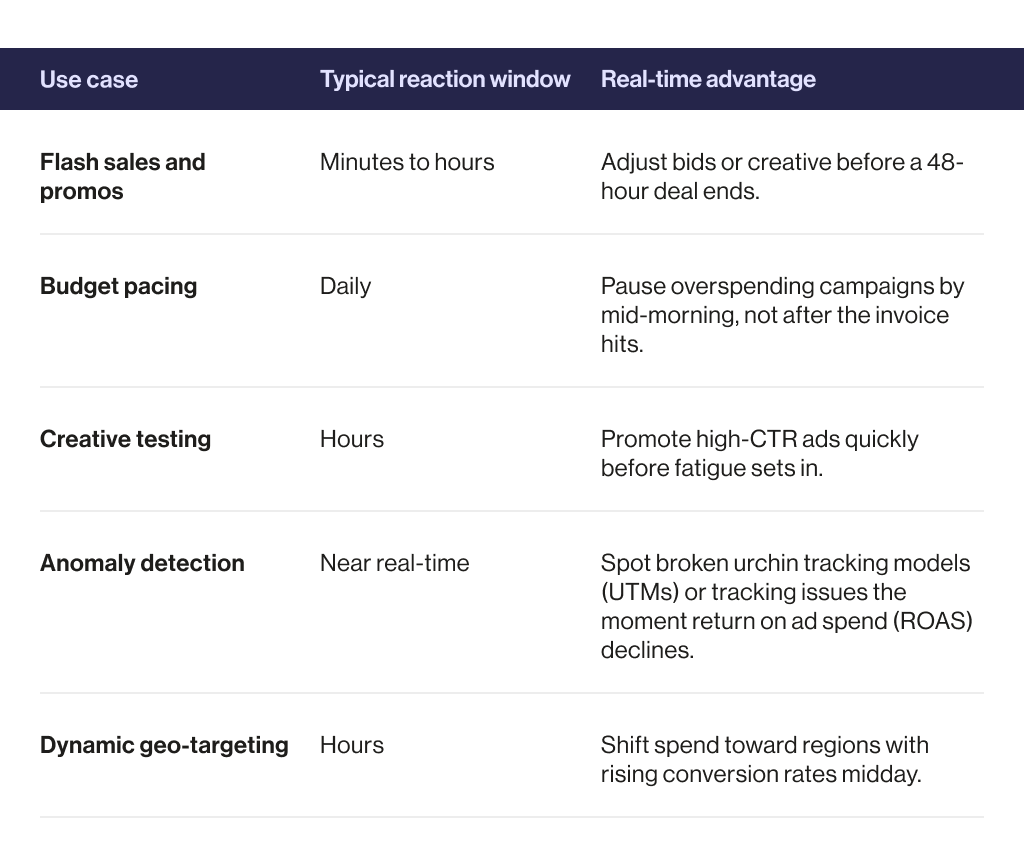 For example, ecommerce marketers often need hourly updates to stay ahead during high-traffic events. Even in business-to-business (B2B) models, where the sales cycle is longer, waiting until weekly reviews can mean overlooking early shifts in campaign performance.