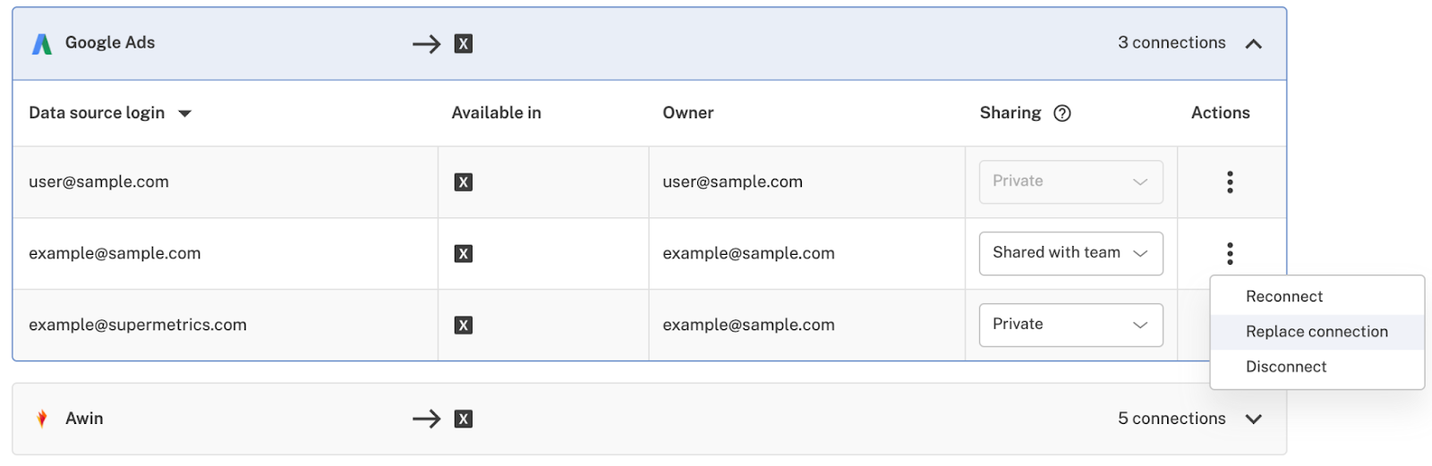 A team admin or owner gets a quick overview of all your team’s connections in any Supermetrics product and has one important new action replacing obsolete connections.
