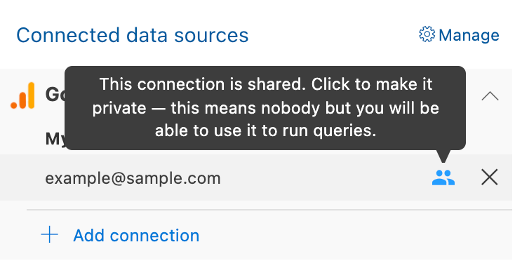 You no longer need to give your credentials or authorize again — everyone in your team can use the same connections to create or refresh queries. Once your team starts sharing, you will see all connections conveniently grouped into your own connections and those shared with you.