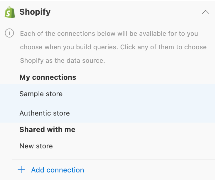 ‘Shared with me’ are the connections created and shared by other team members. You can use these connections when building queries. You can’t edit them, but they won’t appear in your list if the owner stops sharing them.