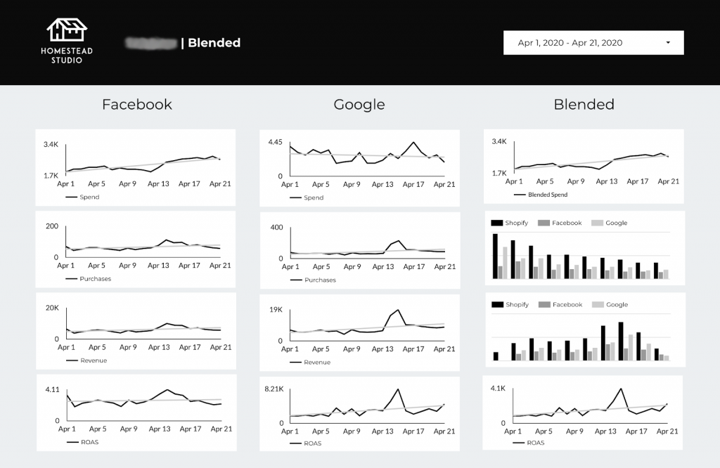 The blended column on the far right helps Zach and his team keep track of their total ad spend, purchases, revenue, and return on ad spend per client. The channel-specific data, on the other hand, is useful for comparing results when they’re running similar campaigns on both Facebook and Google.