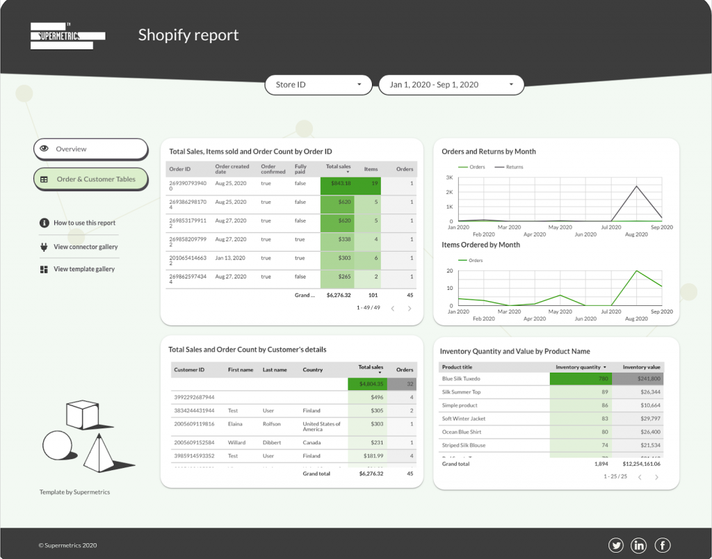 To get this dashboard, simply select “Use report template for new reports” when you’re connecting Shopify to Data Studio with Supermetrics .