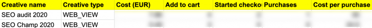 - Select metrics: Cost, add-to-cart, started checkout, purchases, cost per purchase