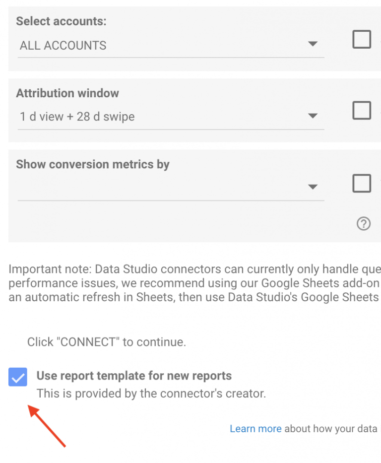 If you want to use the template, simply check the “Use report template for new reports” box when connecting your Snapchat data to Google Data Studio .