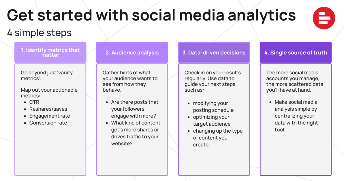 You’re now familiar with the benefits of social media analytics and have an idea of how this data can inform your marketing decisions. However, with so many factors to consider, how do you get started with properly analyzing your social media performance?