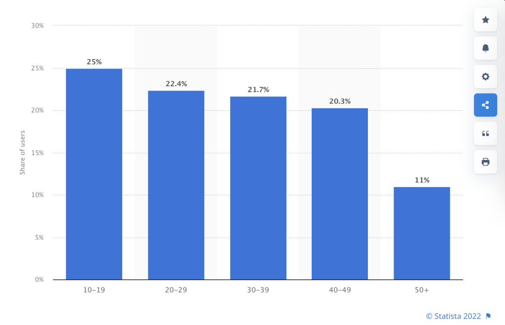 Distribution of TikTok users in the United States as of September 2021, by age group. Source: Statista