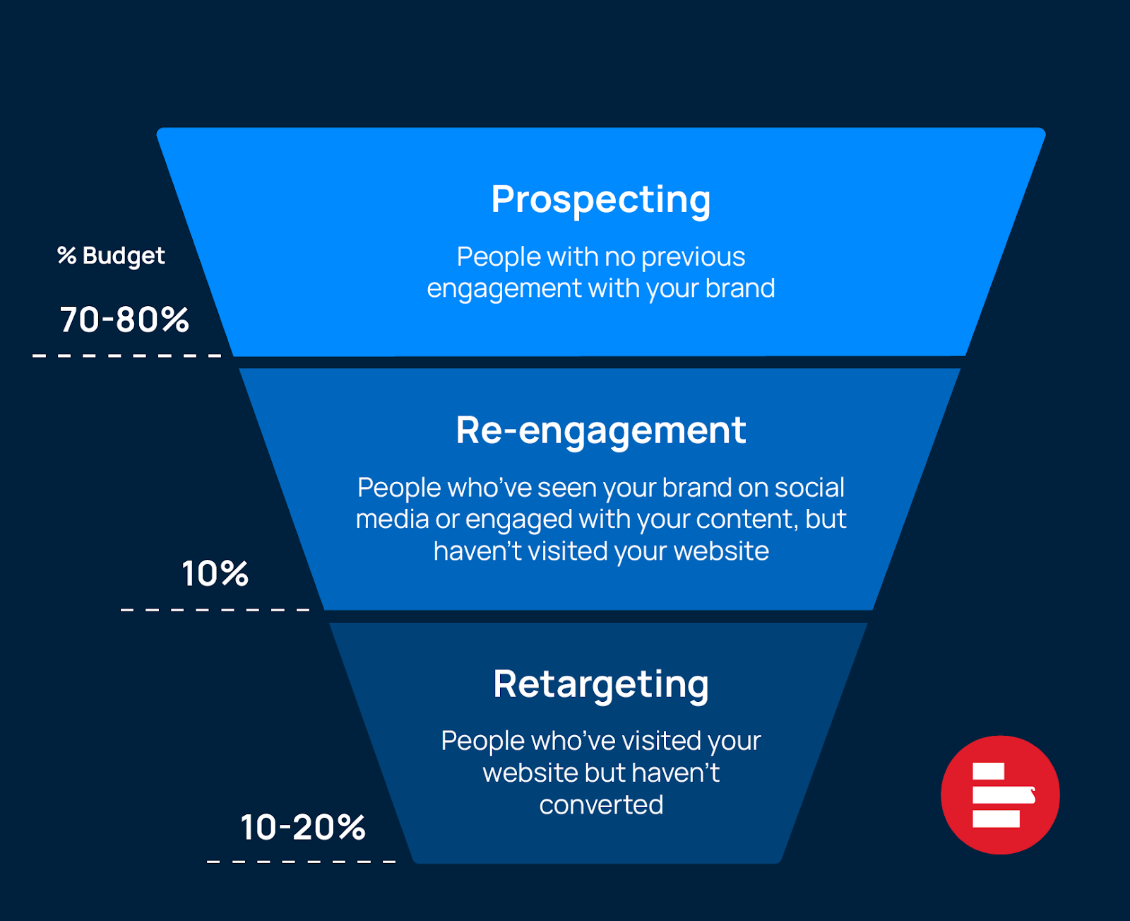 The general guideline is that you should dedicate most of your budget to the top funnel or prospecting campaigns—approximately 70–80% of your overall budget.