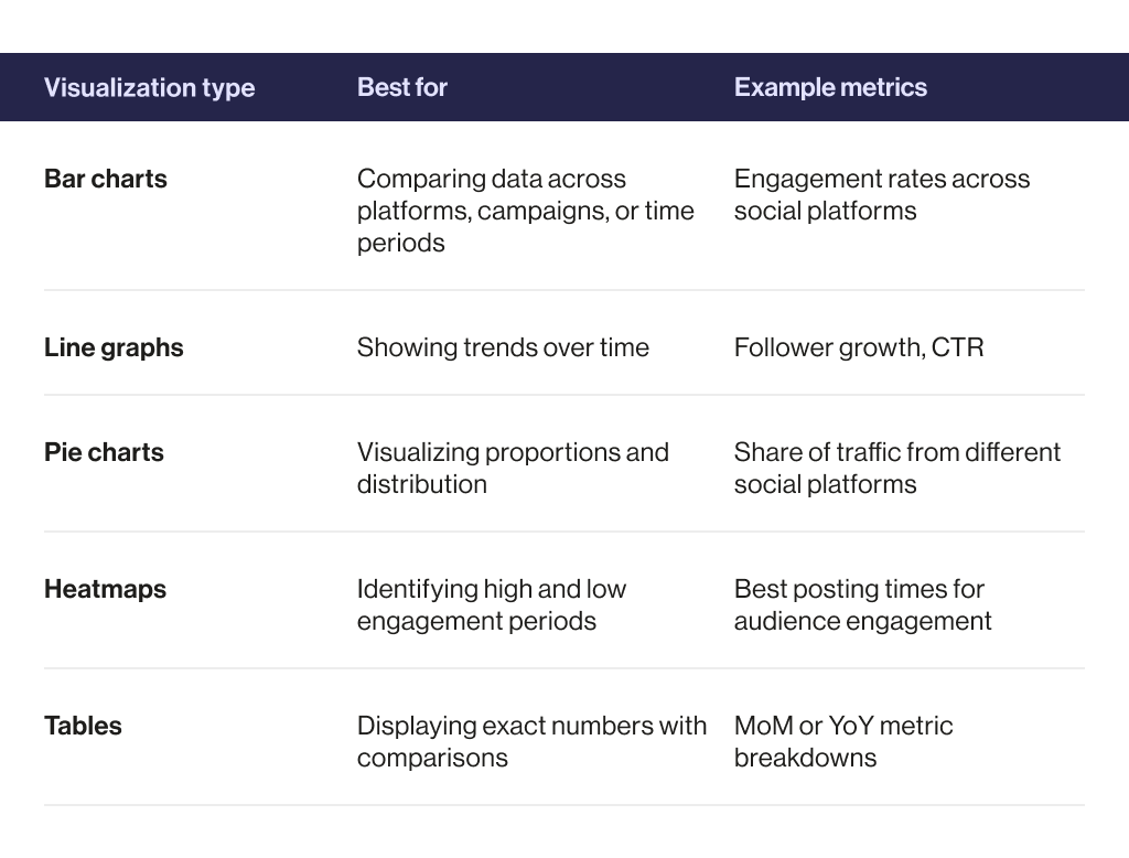 - Use data visualizations strategically. Examples include heatmaps for engagement trends, line charts for growth tracking, and bar graphs for performance comparisons.