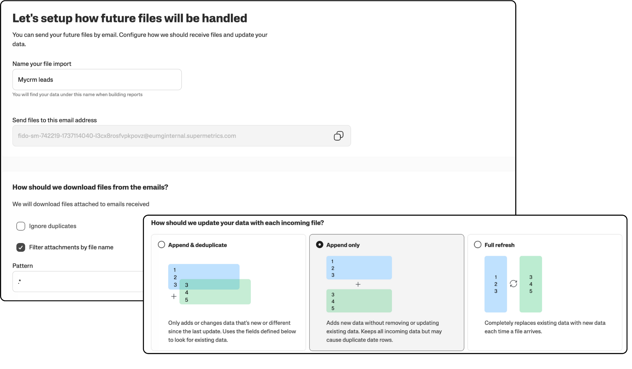 To fully automate your data transfers, you can configure your CRM or source system to send these export files directly to the email address provided by Supermetrics' Custom Data Import tool.