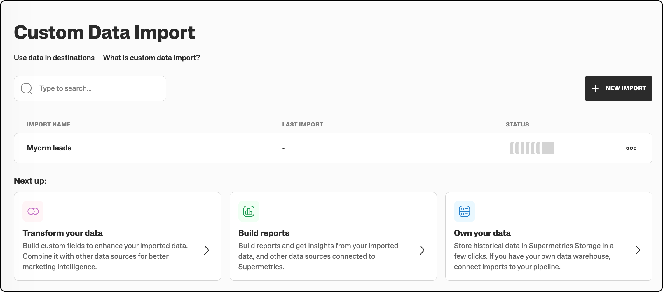 Select ‘New Import’ to start. At this stage, you’ll need to upload a sample of the spreadsheet or file format you intend to use for your data transfer. Supermetrics supports a variety of common file types, including .csv, .xls, or .xlsx formats.