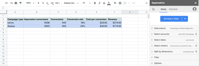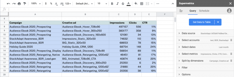 - Use Supermetrics for Google Sheets and Excel to pull the exact metrics you need from StackAdapt to answer specific questions