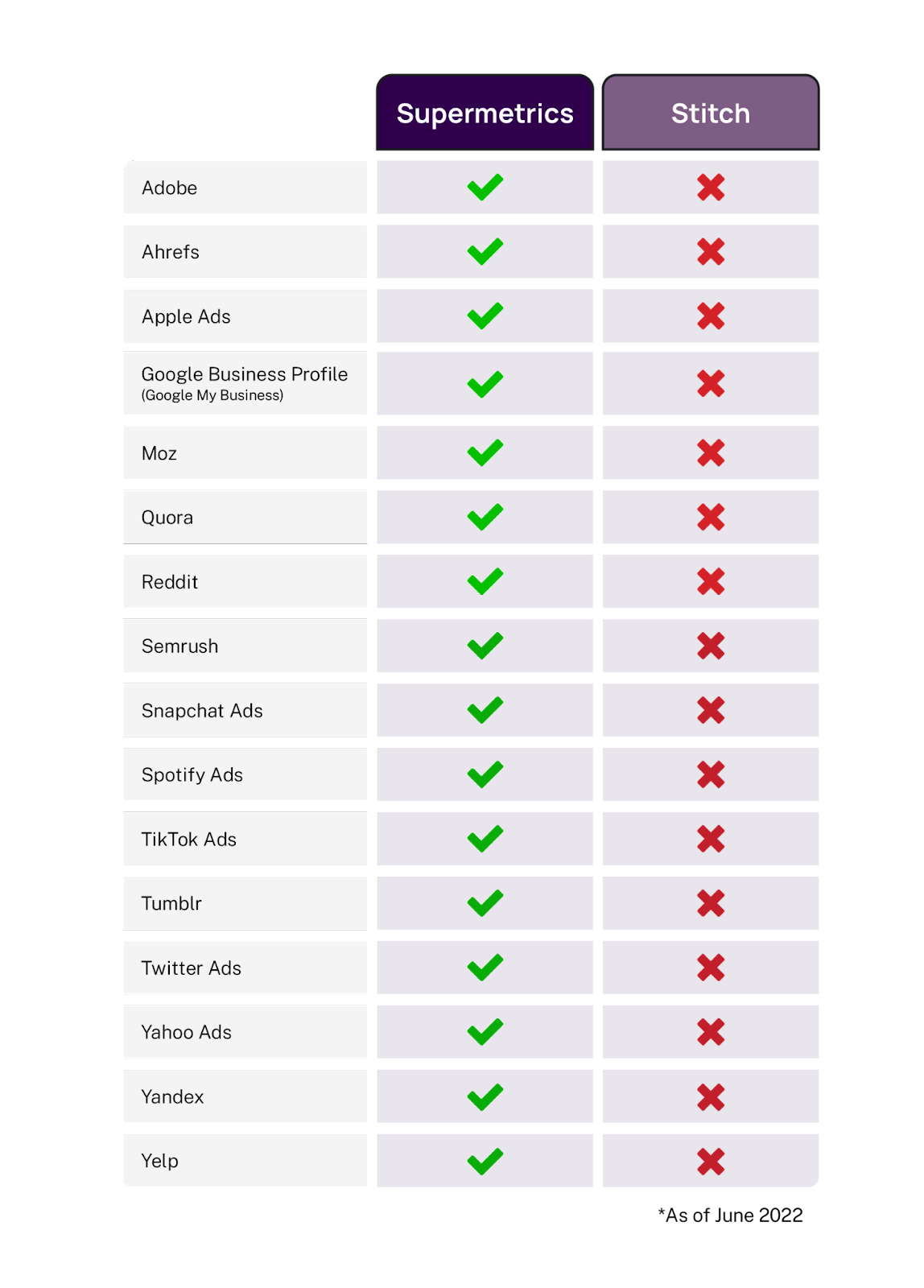 The main difference between Supermetrics and Stitch is that Stitch does not support moving data to Google Sheets, Data Studio, or Excel. They primarily focus on data warehouses and data lakes. Another difference between Supermetrics and Stitch is that Stitch is primarily made for tech and data teams, not for marketing teams and agencies, so it’s not as easy to use and doesn’t support many popular marketing platforms.