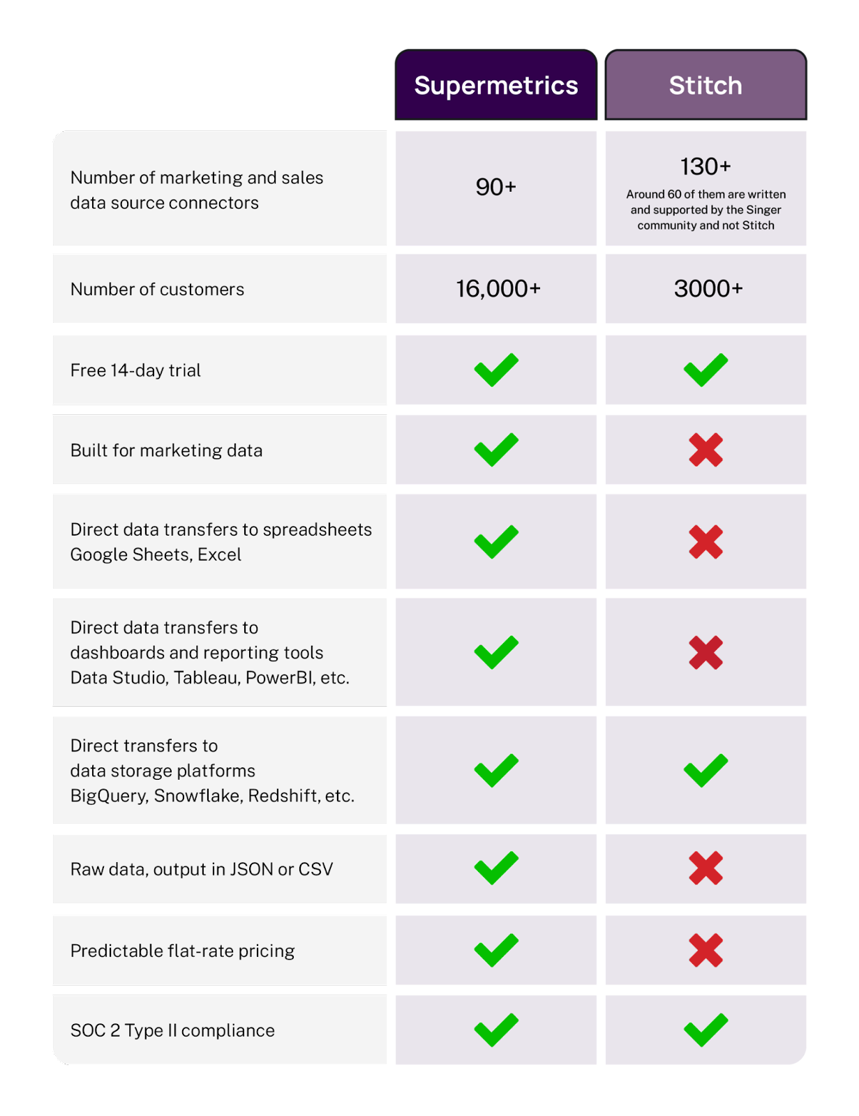 Let’s look at some important parameters to compare Supermetrics with Stitch: